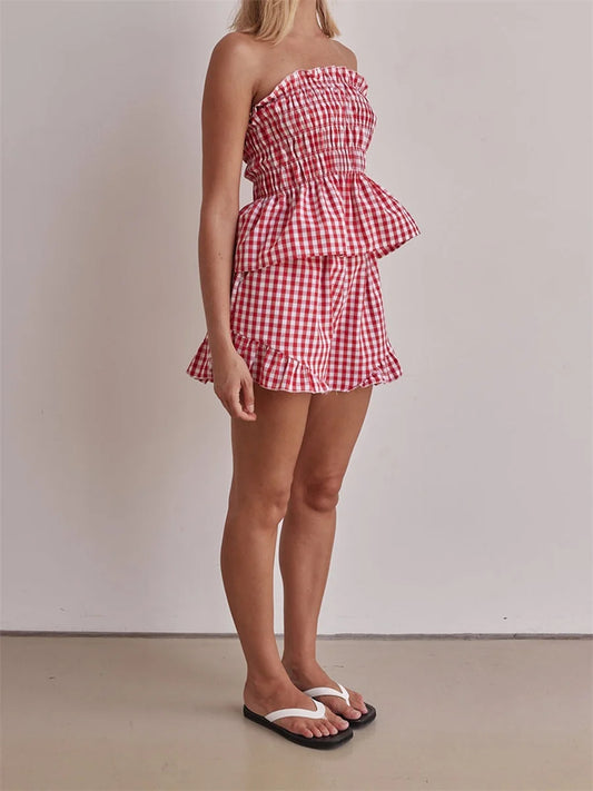 Summer Aesthetic Two-Piece Vacation Outfit With Floral Print And Flowing Ruffled Shorts