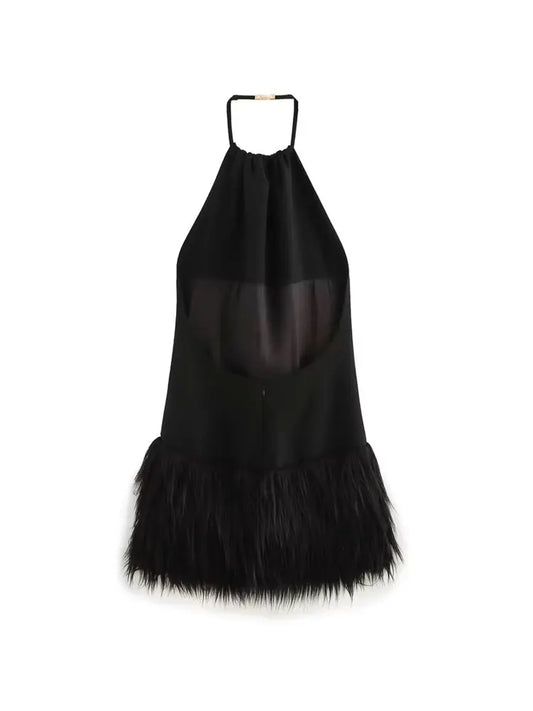 Moto Boho Halter Neck Backless Mini Dress – Sexy Faux Fur Fashion for Women