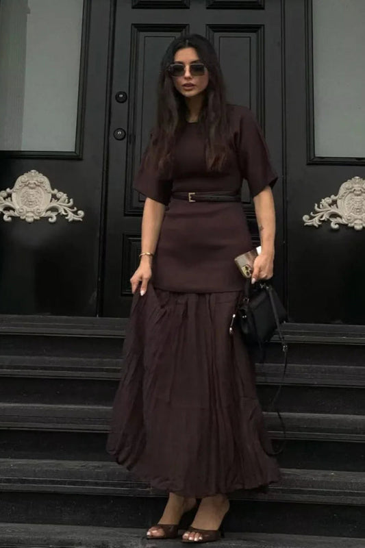 Fall Outfits Casual Pleated Skirt And Zipper Lapel Top Two Piece Outfit - Elegant Autumn Outfit Inspiration Pleated Long Skirt And Lantern Sleeve Top Set