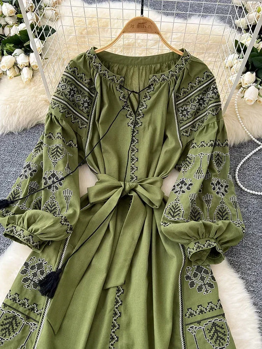 Bohemian Long Dress With Ethnic Embroidery And Cinched Waist For Spring Outfits