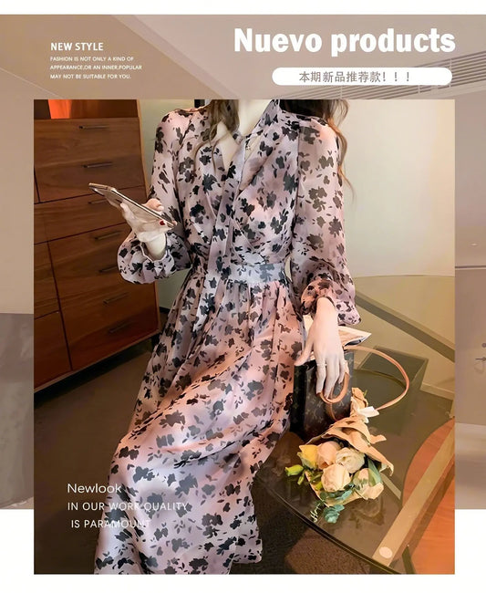 French Style Long Dress With Vintage Print And Tie Waist For Spring Fashion