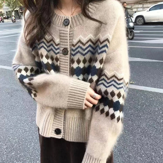 Oversized Button-Up Sweater with Puff Sleeves and Plaid Charm
