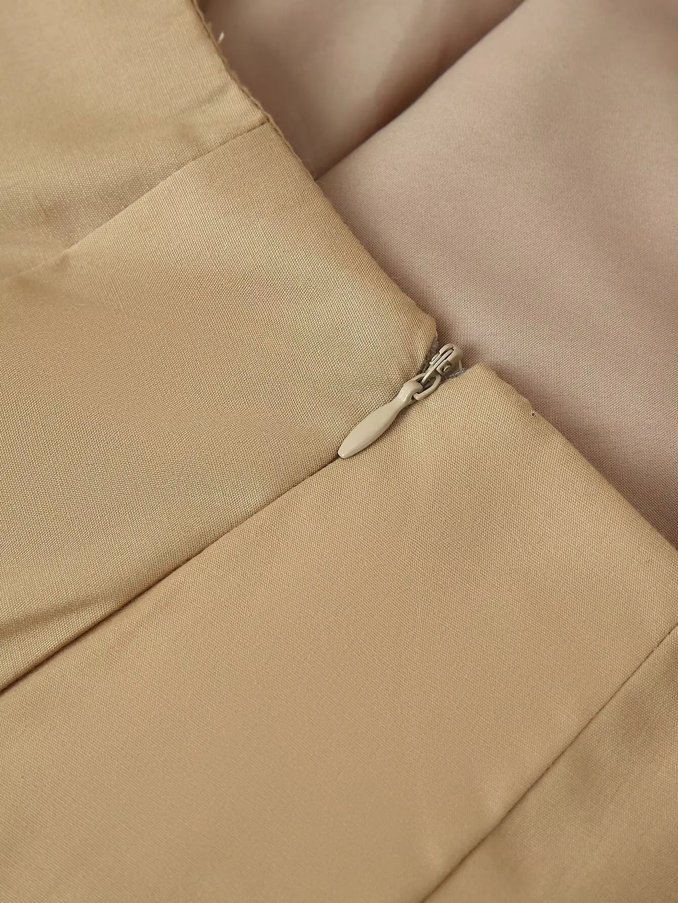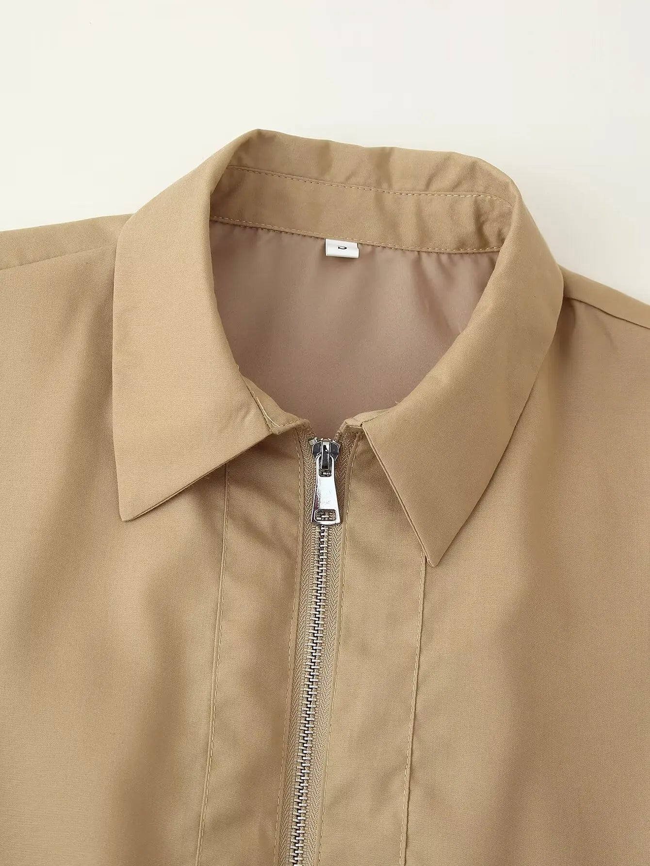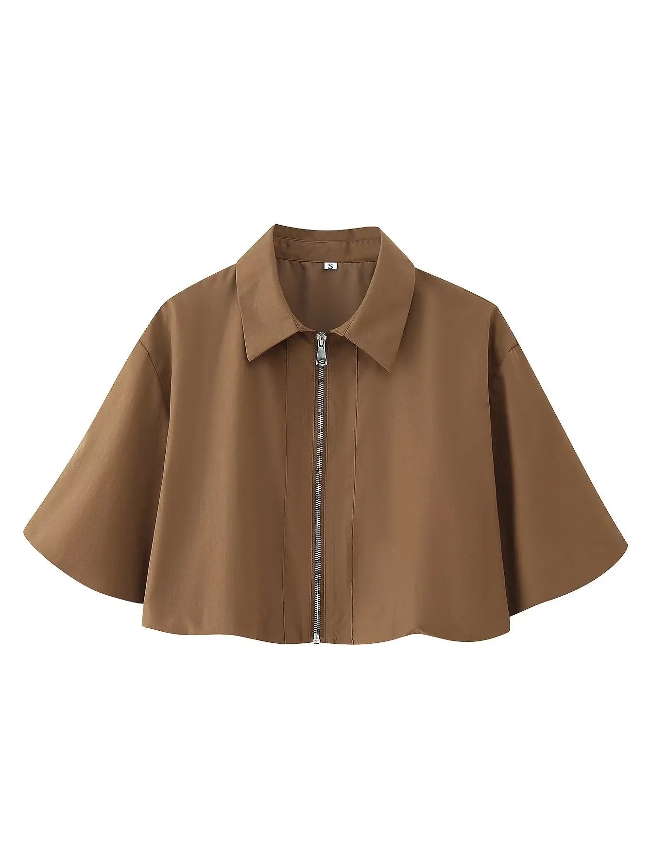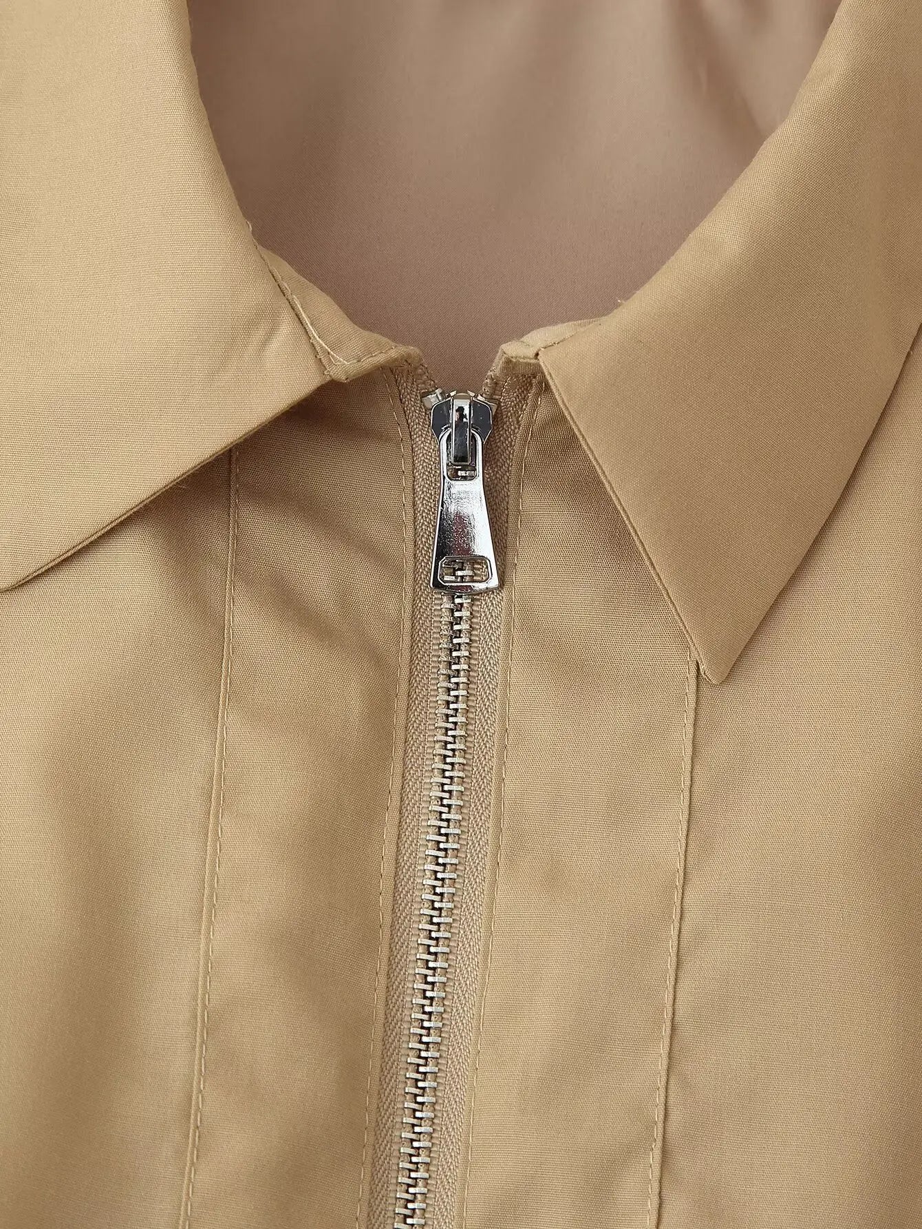 This two-piece set features a slim fit with an A-line silhouette and a mid-calf skirt length. It includes a turn-down collar and half sleeves with a standard design. Crafted from over 96% polyester blended synthetic fiber, it showcases a solid pattern with tatting weave details. The outfit incorporates zipper closures and decorative zippers, with the pants having a zipper fly for ease of wear. Designed for practicality, the full zipper opening ensures convenient dressing.